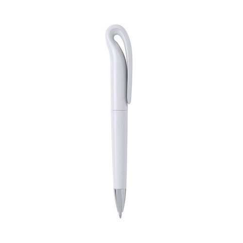 Bolígrafo de mecanismo giratorio de atrevido diseño bicolor con accesorios en vivos colores sólidos y cuerpo de suave acabado en color blanco sólido. Con original clip curvado y punta de acabado plateado brillante. Tinta azul.