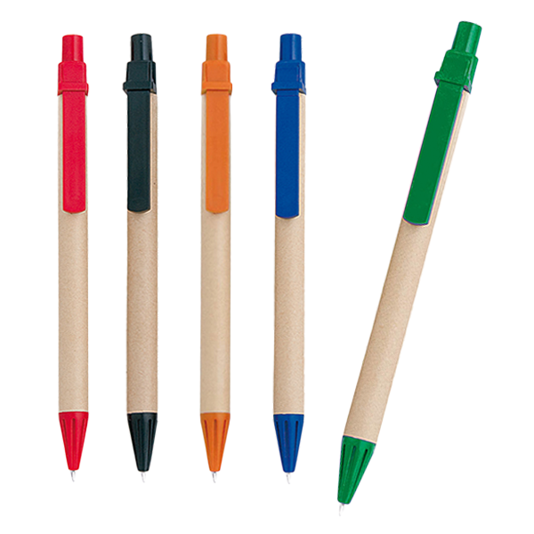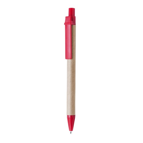 Bolígrafo de mecanismo pulsador en original combinación de cuerpo en cartón reciclado de color natural y accesorios en vivos colores. Tinta negra. Tinta Negra