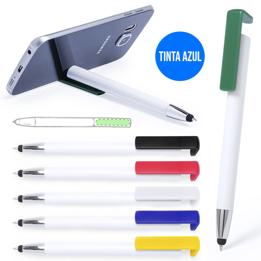 Original bolígrafo puntero de mecanismo pulsador con soporte integrado clip para dispositivo móvil. De atrevido diseño bicolor y con cuerpo en suave acabado de color blanco brillante. Clip en llamativos colores, punta en color plateado brillante y tinta azul.
