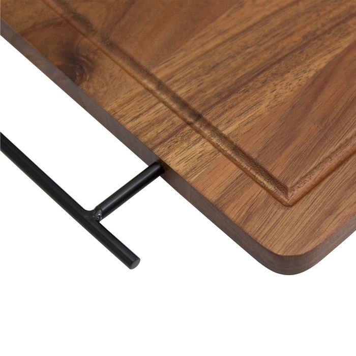 43 x 26 x 1,2 cm. Madera y acero inoxidable. Set de asado. Tabla de corte / Bandeja de madera de acacia con asa de ambos lados de acero de carbono. Contiene 2 utensilios de acero inoxidable 420 y mangos de madera de acacia: Cuchillo de 33,5 cm y 150 g, y Tenedor de 31,5 cm y 115 g. Cada utensilio y el set completo se presentan en caja de regalo kraft.