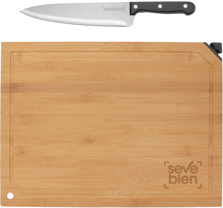 40 x 30 x 1.2 cm. Bambú. Set de corte. Tabla de Bambú con afilador incorporado y cuchillo. Cuchillo de acero inoxidable con mango en madera color negro de 32.5 cm . Afilador de plástico y acero de 5 x 2,4 x 1,2 cm. Presentación en caja de regalo.