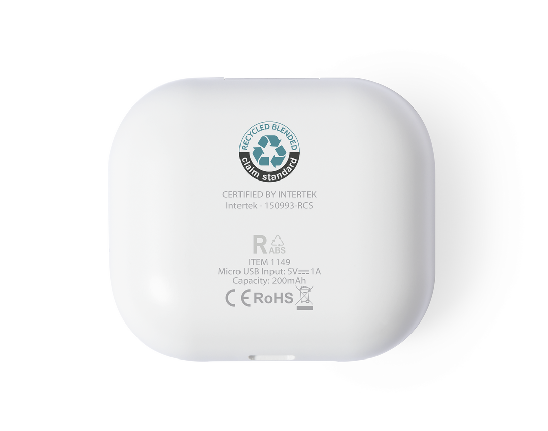 Auriculares intraurales de línea nature y conexión Bluetooth® 5.0, con batería de litio y en elegante acabado de color blanco. Fabricados en ABS reciclado (RABS) y con certificación RCS, que garantiza el origen reciclado del mismo. De diseño ergonómico, incluyen botón de control integrado en el auricular, con base de carga a juego e indicador LED de estado de carga. Función manos libres y recargables, con cable micro USB incluido. Presentados en atractiva caja de diseño eco. Conexión Bluetooth. Batería 35 mAh/ Base Carga 200 mAh