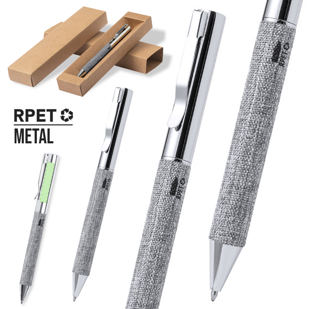 Bolígrafo fabricado en metal cromado y con cuerpo recubierto en poliéster RPET, elaborado a partir de plástico reciclado para así fomentar la reutilización de residuos plásticos y ayudar a la sostenibilidad del planeta. Elegante clip metálico y accesorios a juego, de mecanismo giratorio y en tinta azul. Con distintivo RPET en cuerpo y presentado estuche kraft con funda a juego.