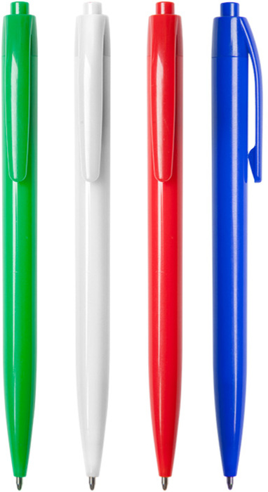 Plástico. Bolígrafo con cuerpo plástico de color con pulsador. Tinta negra.