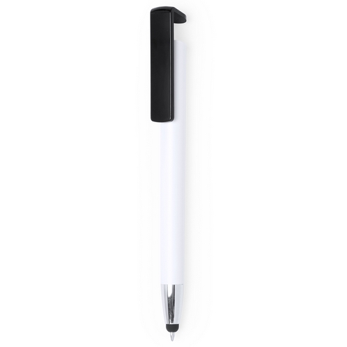 Original bolígrafo puntero de mecanismo pulsador con soporte integrado clip para dispositivo móvil. De atrevido diseño bicolor y con cuerpo en suave acabado de color blanco brillante. Clip en llamativos colores, punta en color plateado brillante y tinta azul.