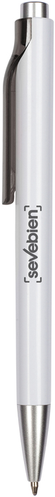 Plástico. Cuerpo blanco. Pulsador y punta color plata. Clip con detalle de color transparente. Tinta negra.