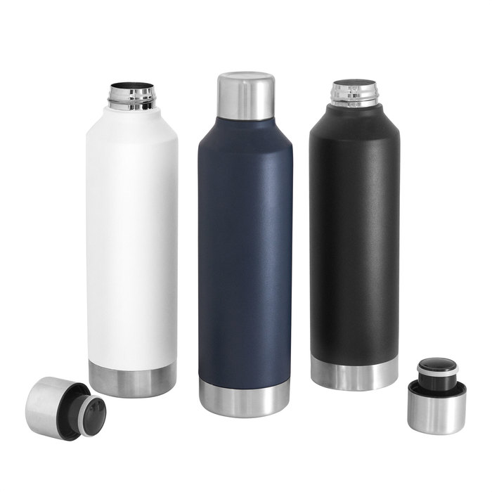 Ø 7 x 25 cm. Capacidad 550 ml. Acero inoxidable. Botella doble pared, sellada al vacío. Interior en acero 304 y exterior en acero 201. Tapa de acero 201 a rosca con anillo de silicona. Pintura Powder coat (pintura más duradera y resistente a la corrosión y el paso del tiempo). Mantiene hasta 12 hs la temperatura de las bebidas calientes y 24 hs de las bebidas frías. Presentación en caja de regalo Kraft.