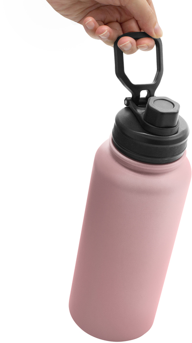 Ø 9 x 26 cm. Capacidad 1000 ml. Acero inoxidable. Botella deportiva doble pared, sellada al vacío. Interior en acero 304, exterior en acero 201. Tapa con anillo de silicona, boquilla con cierre a rosca antiderrame y manija plástica para su agarre. Mantiene hasta 12 hs la temperatura de las bebidas calientes y 24 hs de las bebidas frías. Presentación en caja de regalo.