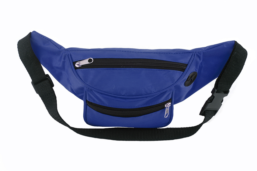 33 x 14,5 cm. Polyester 420D. Cangurera de 2 bolsillos. Salida para audífonos. Correa ajustable con herrajes plásticos. Cierres metálicos.