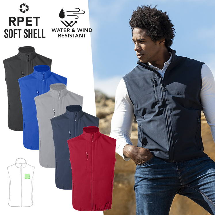 Chaleco impermeable y transpirable en combinación de materiales RPET, elaborados a partir de plástico reciclado, para así fomentar la reutilización de residuos plásticos y contribuir a la sostenibilidad del planeta: exterior en soft shell y elastano de 300g/m2 con interior en 100% poliéster microfleece. Con distintivo eco en dobladillo inferior de la prenda. Resistente al viento y al agua con cierre principal y bolsillos frontal en pecho y laterales de cremallera invisible y tiradores a juego. Disponible en variada gama de colores y en tallas S, M, L, XL, XXL. Resistente al Viento y al Agua