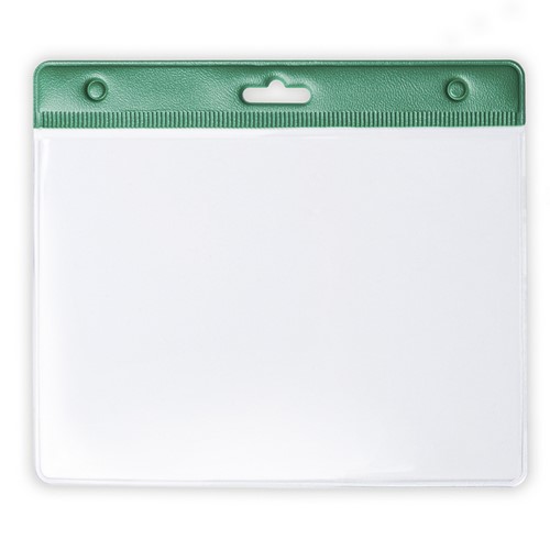 Identificador troquelado en PVC con cabecera en variados colores, ventana frontal transparente y parte trasera transparente.