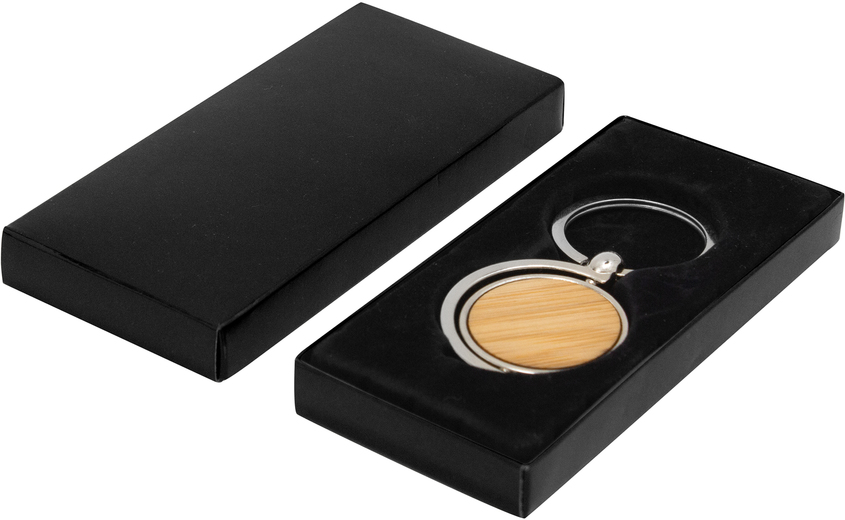7,5 x 3,5 x 0,4 cm. Llavero circular de bambú con detalles metálicos. Estructura giratoria 360°. Presentación en caja de regalo.