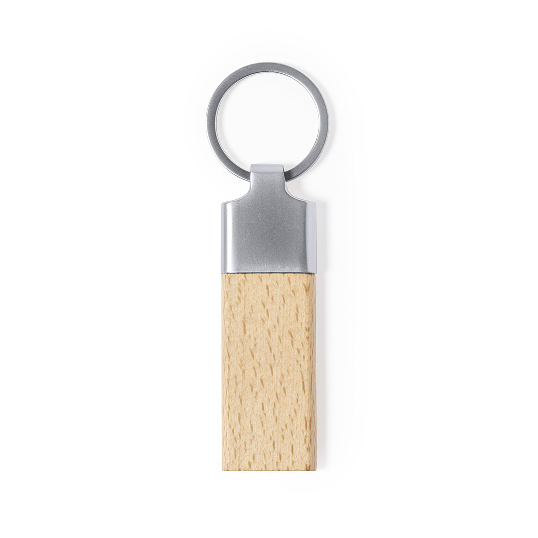 Llavero en combinación de materiales metal de acabado brillante y madera de haya barnizada. Con amplia superficie para marcaje y presentado en bolsa individual con tarjeta kraft.