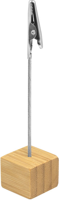 2,5 x 2,5 x 2,5 cm. Alto 11,5 cm Bambú y metal. Memo clip de escritorio con base cúbica en bambú. Broche pinza cocodrilo de metal. Práctico, útil y transportable.