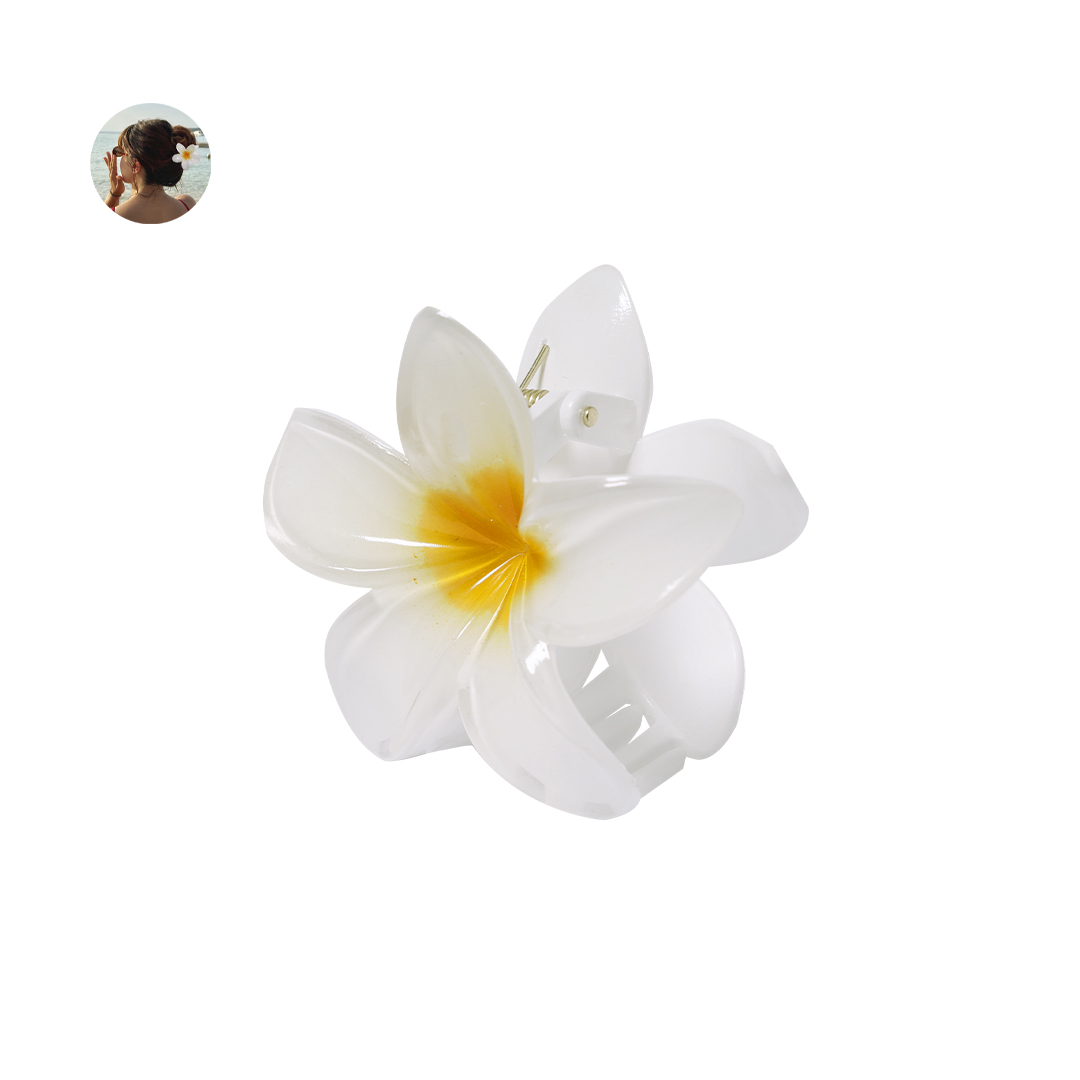 Pinza para el pelo con diseño original en forma de flor blanca y centro amarillo. Cuenta con 8 resistentes dientes que garantizan una sujeción cómoda y segura.