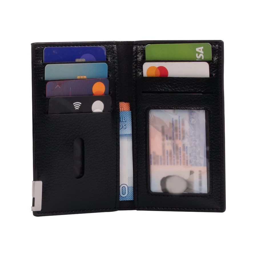 Billetera portas-tarjetas de eco-cuero negro, formato vertical, modelo "LICENSE". Contiene 8 compartimentos interiores. Presentación en bolsa frozen y caja de cartón forrado negro opaco.