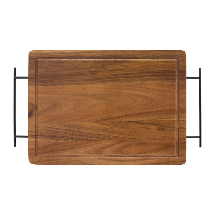 43 x 26 x 1,2 cm. Madera y acero inoxidable. Set de asado. Tabla de corte / Bandeja de madera de acacia con asa de ambos lados de acero de carbono. Contiene 2 utensilios de acero inoxidable 420 y mangos de madera de acacia: Cuchillo de 33,5 cm y 150 g, y Tenedor de 31,5 cm y 115 g. Cada utensilio y el set completo se presentan en caja de regalo kraft.