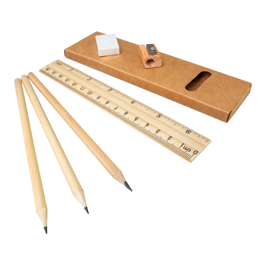 Set Escolar Ecológico. Incluye 3 lápices grafito negro largos de madera + 1 regla de 16.5 cm. de madera + 1 sacapuntas de madera + 1 goma de borrar. Presentación en Estuche ecológico de cartón reciclado.