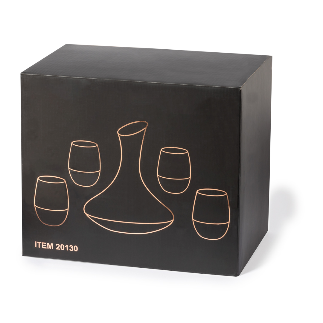 Elegante set de vinos fabricado en cristal, con delicado e innovador recubrimiento rosado degradado. Un regalo de diseño que incluye 4 vasos de 500 ml y un decantador de 1,8 l.Presentado en exclusiva caja individual de diseño negra. 4 Vasos 500 ml. Decantador 1,8 L