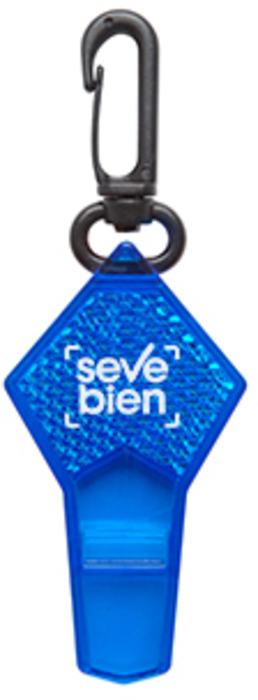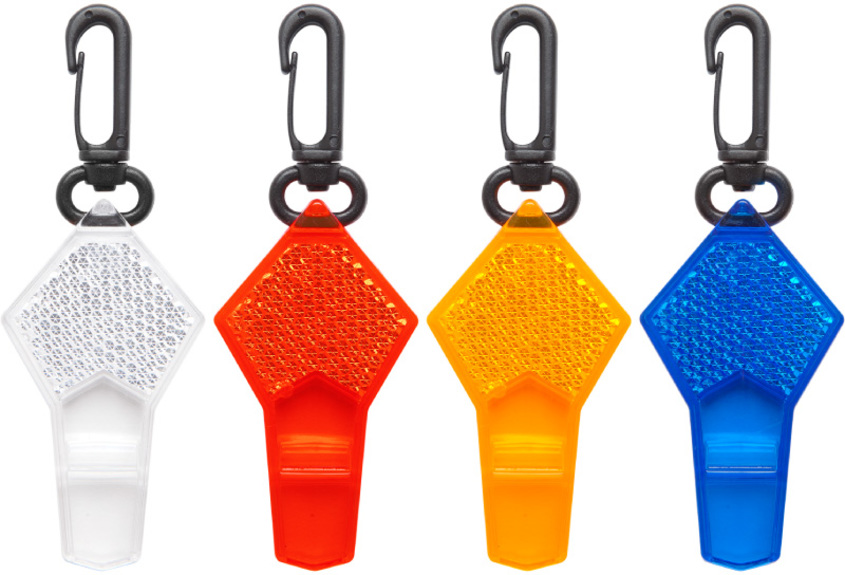 7,5 x 4 cm. Material reflectante. Silbato transparente con formato romboide. Mosquetón color negro.
